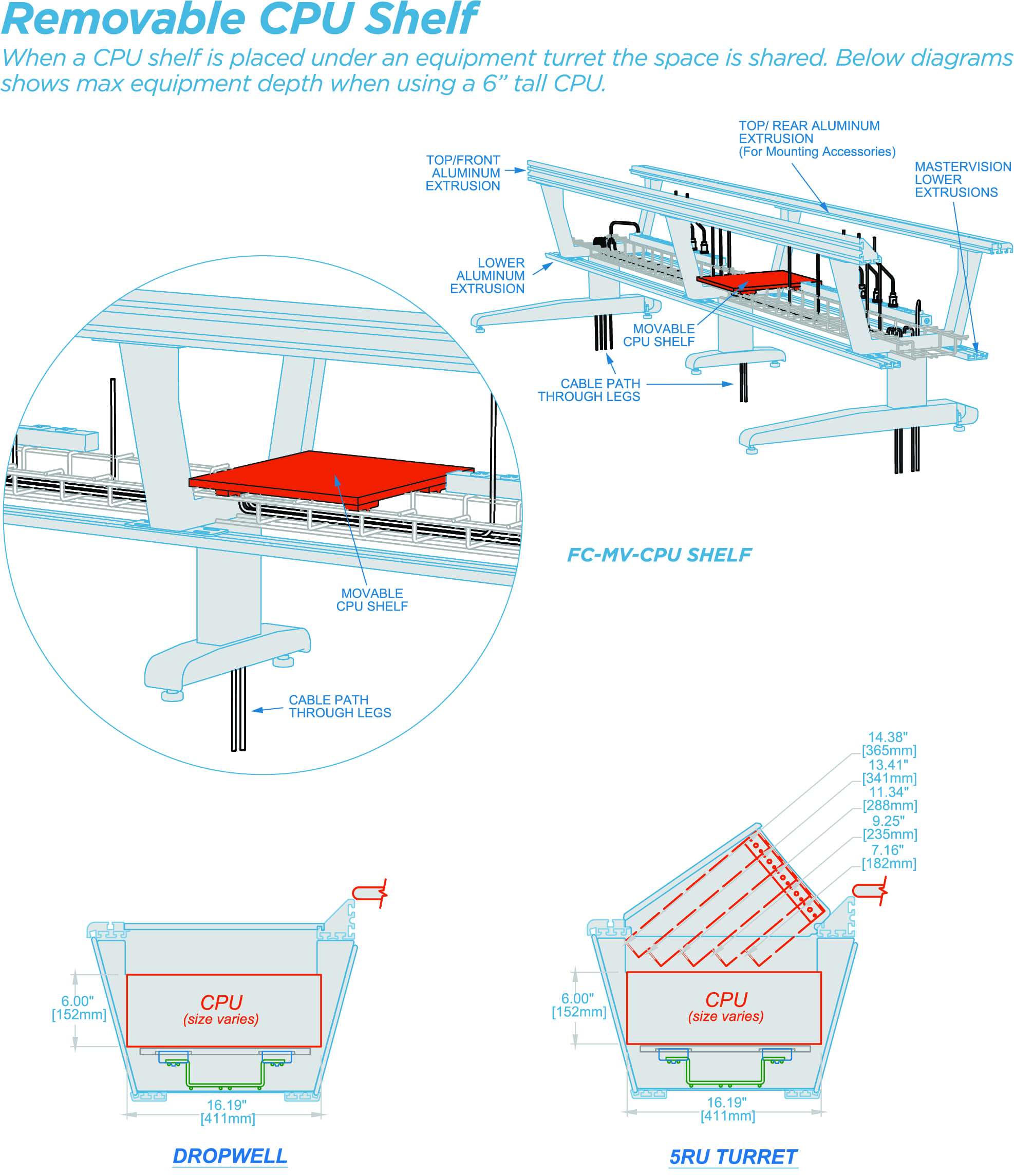 MasterVision™ rack turrets and monitor drop wells can easily be removed and replaced to meet changing equipment needs. Just lift and replace, no tools needed.