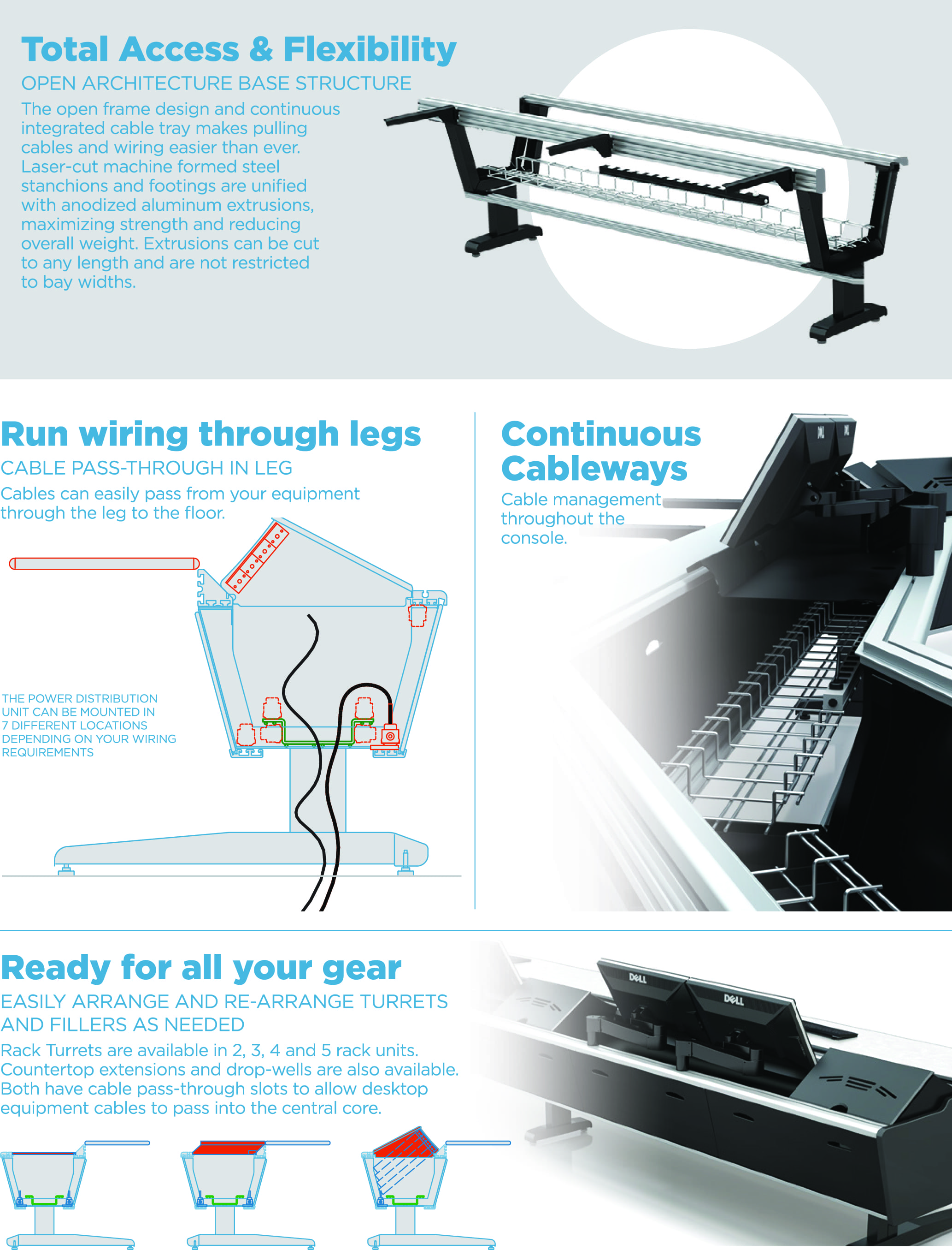 Minimalist look without sacrificing strength or flexibility. Laser-cut machine-formed steel stanchions and footings are unified with anodized aluminum rails, maximizing strength and reducing overall weight. The open frame design and continuous integrated cable tray makes pulling cables and wiring easier than ever.